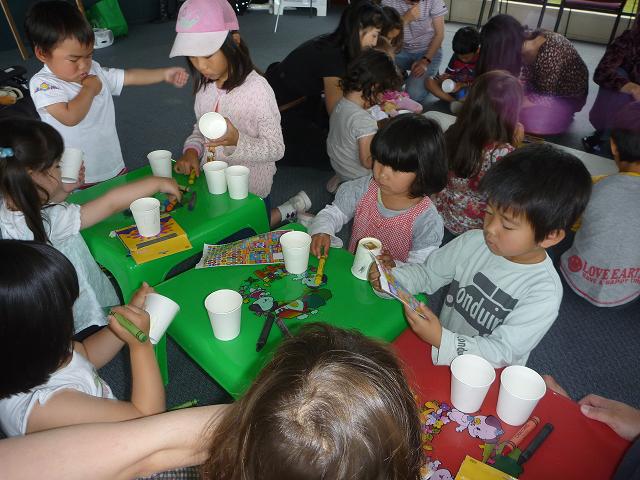 紙コップを二つもらって、絵を描いたり、シールを貼ったり。